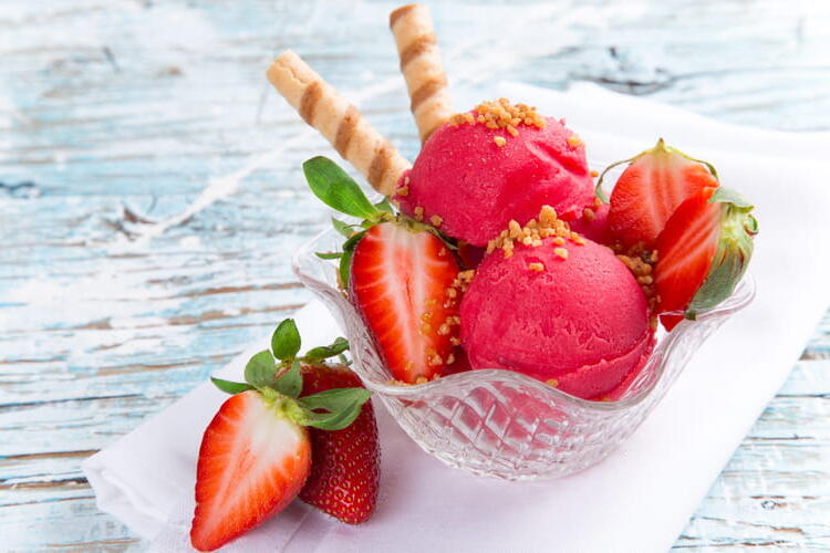 Mix the blended strawberries with the syrup. Pour into a mold and place in the freezer. Every 15 minutes, stir to dissolve the ice crystals until the sorbet is smooth and homogeneous.