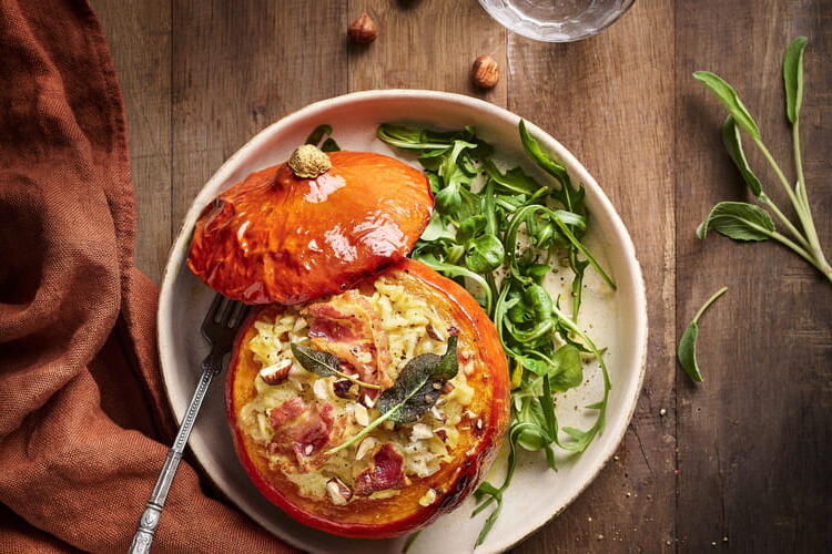 A recipe for stuffed pumpkin with risotto, pancetta, sage, and hazelnuts. Discover a simple recipe that offers an original and tasty way to serve risotto.