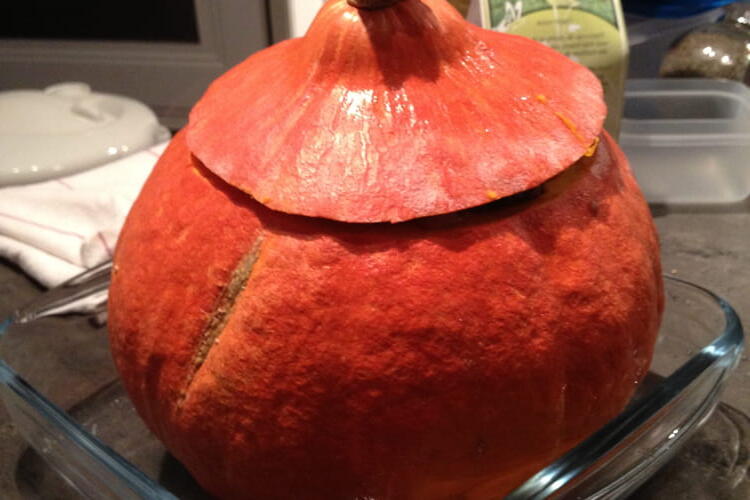 Preparation of the squash: Prepare the squash by cutting off the top and, using the opening, remove all the seeds without damaging the flesh. Place it in a baking dish as it may crack during cooking.