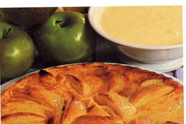 To finish, as soon as the apples are tender (approximately 30 minutes), pour in the custard and return to the oven. Serve warm.