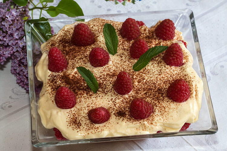 Dilute 50 ml of raspberry syrup and soak the pink biscuits. Place a first layer of biscuits at the bottom of your dish. Cover them with mascarpone cream. Arrange raspberries on top of the cream. Cover with mascarpone cream, then add a layer of biscuits. Finish with a layer of cream. Decorate with a few raspberries, dust with unsweetened cocoa, and add mint leaves for decoration. Refrigerate for at least 2 hours.