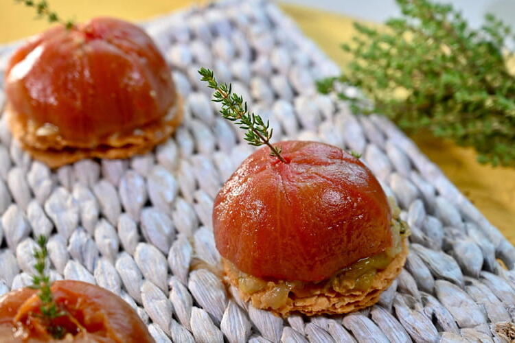 To finish Presentation: Place the onion confit on the flat side of the tomatoes. Top with a circle of puff pastry and turn the whole thing over. Lightly brush the tomatoes with olive oil to make them shine, and garnish with a sprig of fresh thyme.
