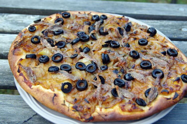 Assembly Preheat the oven to 250°C or gas mark 7 (10 minutes). In a pie dish, spread the pastry. Prick the pastry with a fork. A little tip: drizzle some olive oil once the pastry is pricked, spread the lightly caramelized onions on the pastry. Add the olives and anchovies.