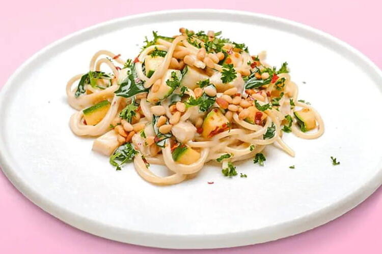 Incorporate the zucchini and pasta into the sauce. Then serve.