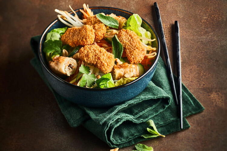 Here is a recipe for vegetarian bo bun with nuggets, perfect for a delicious healthy meal. This recipe features rice vermicelli, nuggets, spring rolls, mung bean sprouts, carrot, cucumber, peanuts, lettuce, mint, and cilantro. It is easy to prepare and will introduce you to beautiful flavors.
