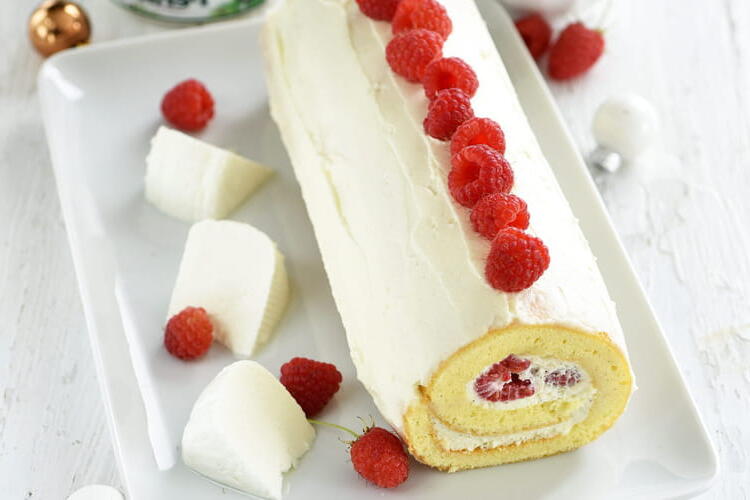 Cover it with half of the cream and spread the raspberries. Roll it again using the film. Close the film and then place everything in the refrigerator for two hours.