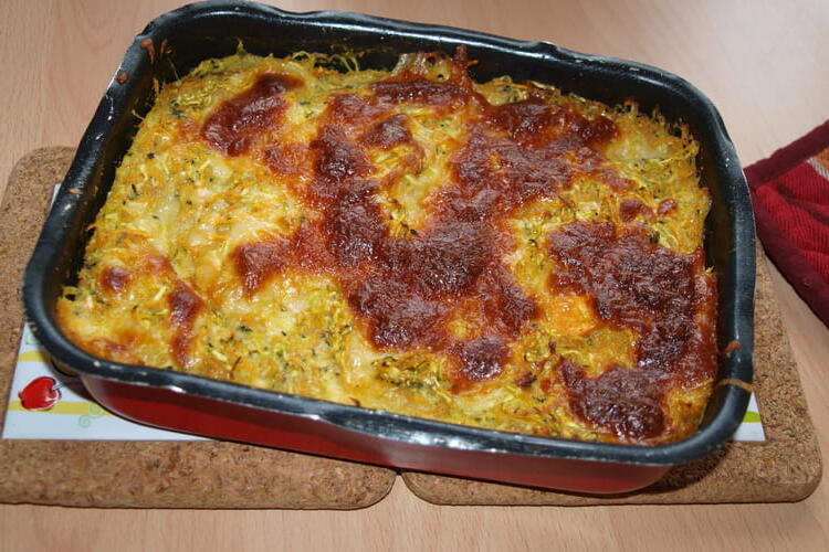 Grate the zucchini and sweet potato using a food processor. Put everything in a mixing bowl. Beat the egg, seasoning with salt and pepper. Add the egg to the vegetables and mix. Pour into a baking dish and sprinkle with grated cheese. Preheat the oven to 180°C and bake for 30 minutes.
